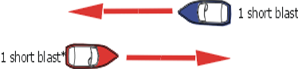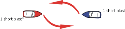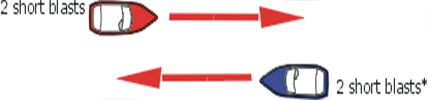 It is generally accepted that you should alter course to starboard and pass port-to-port. The accompanying sound signal is one short blast. If you cannot pass port-to-port due to an obstruction or other vessels, you should sound two short blasts to indicate your intention to pass starboard-to-starboard. Make sure the other vessel understands your intent before proceeding. The other vessel should return your two-short-blast signal.